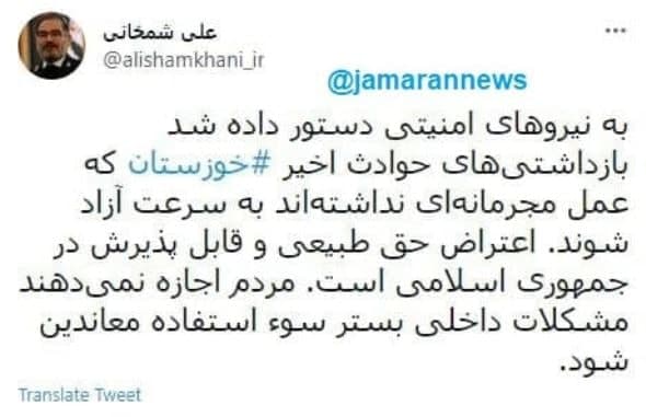 شمخانی در توییتر نوشت: دستور آزادی بازداشتی‌های اخیر خوزستان که عمل مجرمانه‌ای نداشتند، صادر شد.