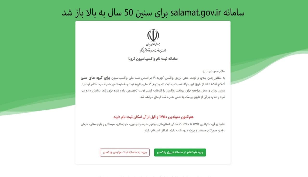 سامانه salamat.gov.ir برای سنین ۵۰ سال به بالا باز شد و این افراد میتوانند وارد سامانه و نوبت دهی شوند.