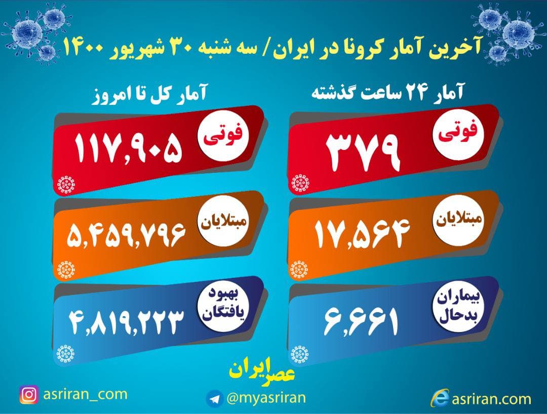 آخرین آمار کرونا در کشور سه‌شنبه ۳۰ شهریور (اینفوگرافیک)