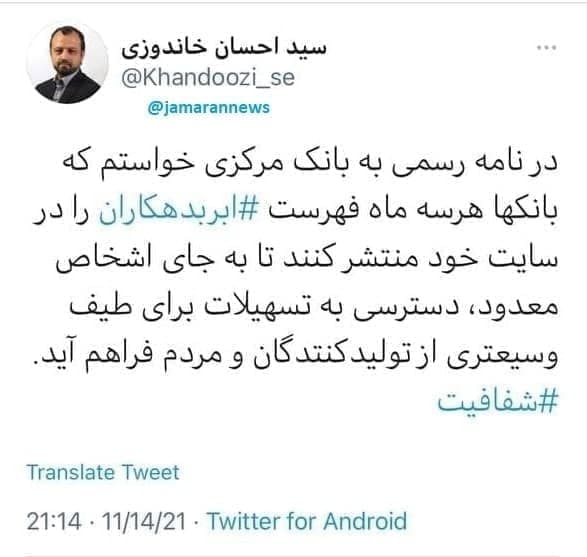 خاندوزی، وزیر اقتصاد، در توییتی نوشت: در نامه رسمی به بانک مرکزی خواستم که بانکها هرسه ماه فهرست ابربدهکاران را در سایت خود منتشر کنند تا به جای اشخاص معدود، دسترسی به تسهیلات برای طیف وسیعتری از تولیدکنندگان و مردم فراهم آید./فارس