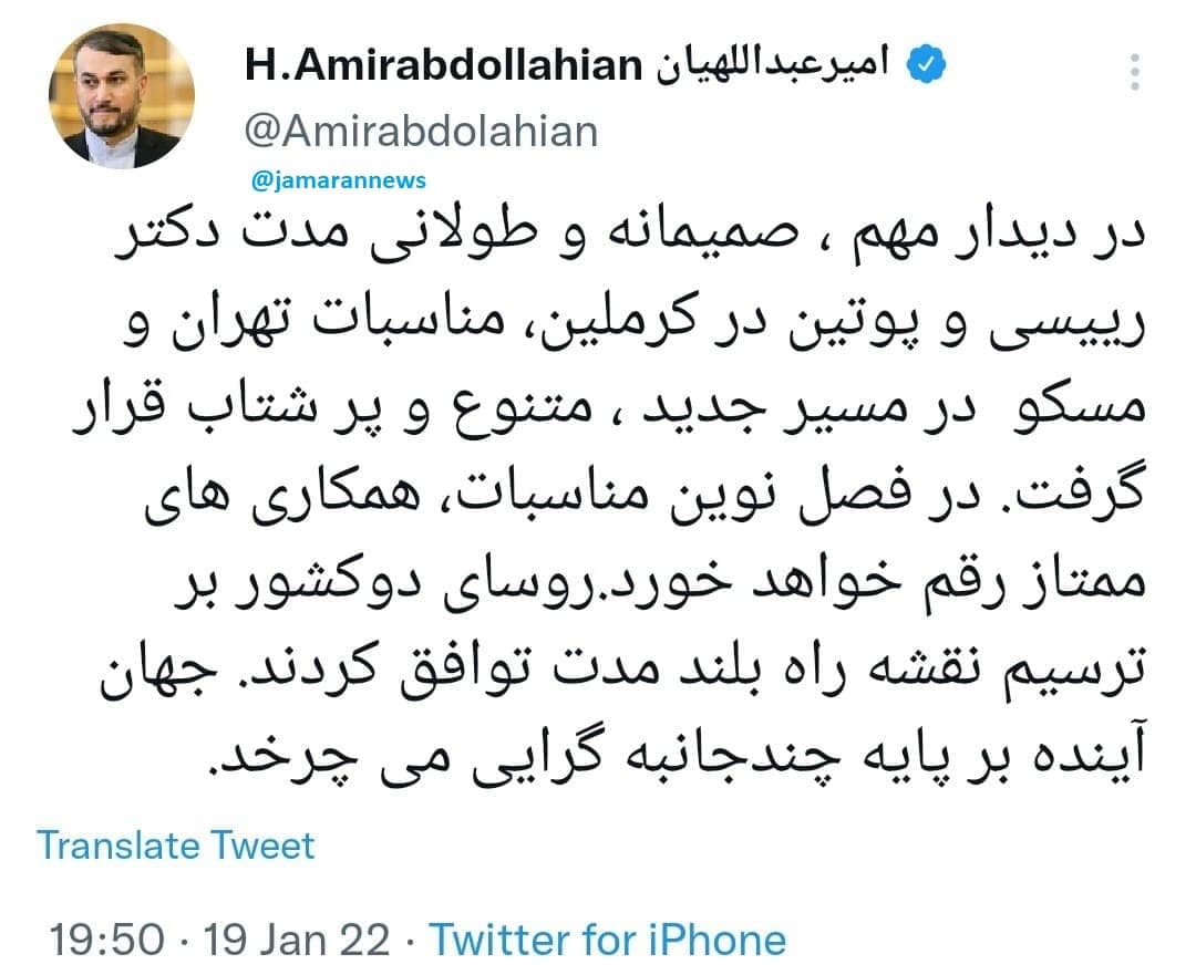امیرعبداللهیان: رئیسی و پوتین بر ترسیم نقشه راه بلند مدت توافق کردند