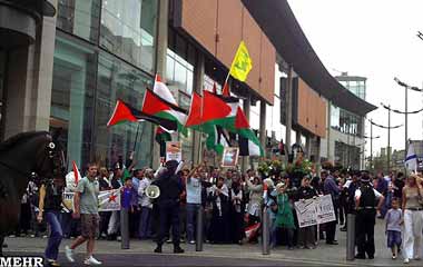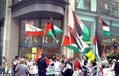 تجمع اعتراض آمیز مردم شهر منچستر در مقابل مرکز خرید صهیونیستی