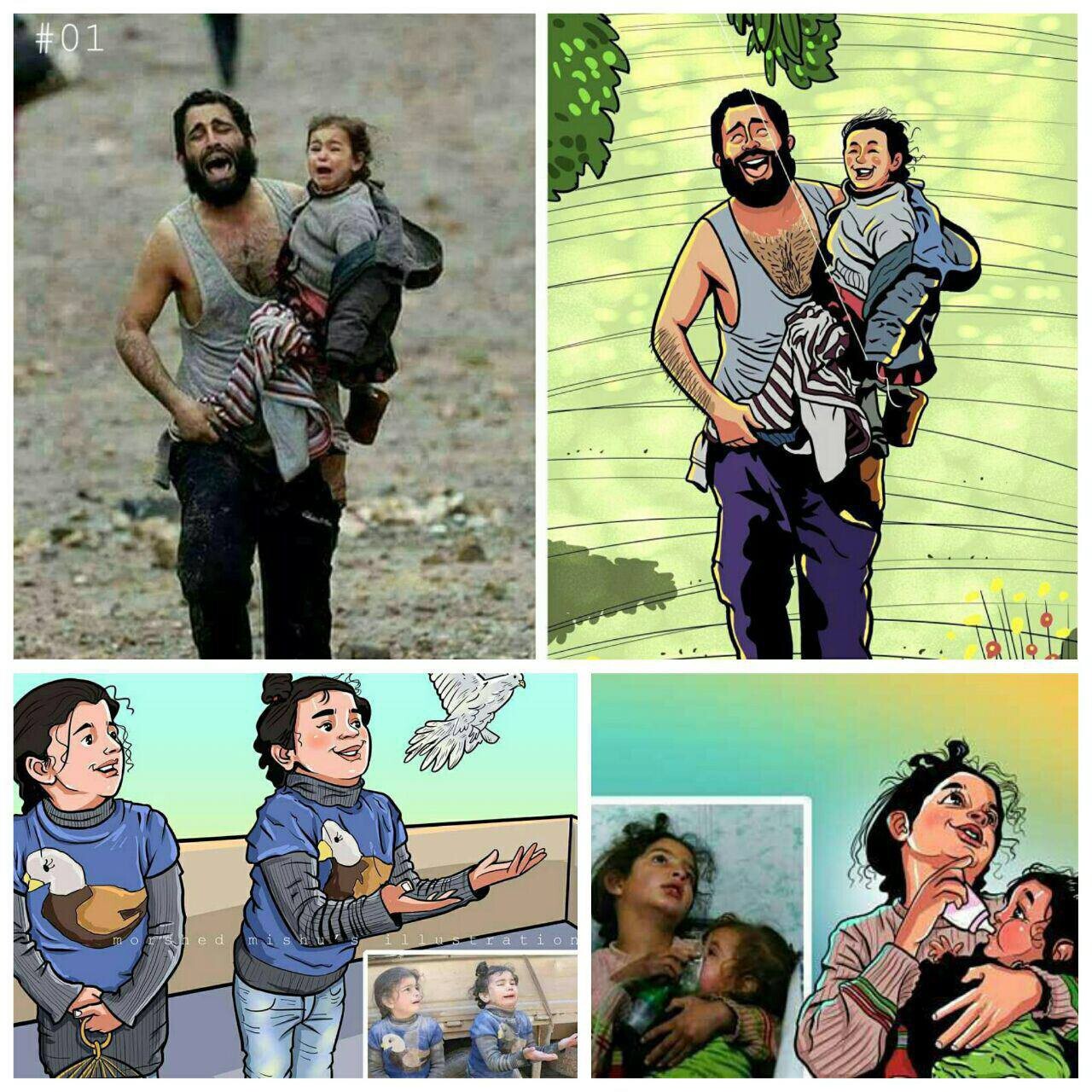هنرمند بنگلادشی در نقاشیهاش از عکس کودکان غمگین درگیر با جنگ، تصاویر شادی ساخته است.