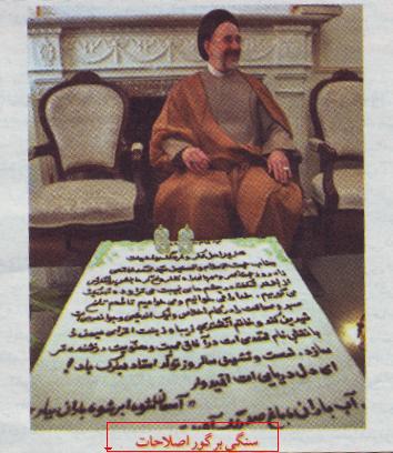 نشریه "شما" ارگان حزب موتلفه این تصویر و زیر نویس آن را منتشر کرده است. جشن تولد 66 سالگی خاتمی چند روز پیش برگزار شد.